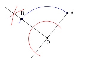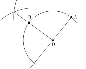 半径\(\,\mathrm{OA}\,\)の円を描き交点を\(\,\mathrm{B}\,\)とする。(以上)