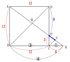 相似比が\(\,12:16=\color{red}{③}:\color{red}{④}\,\)の三角形から\(\,\mathrm{AQ}\,\)を求めます。