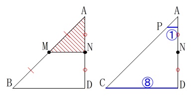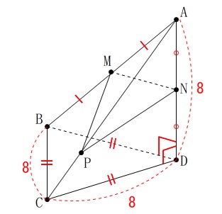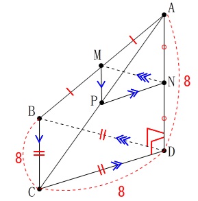 点\(\,\mathrm{P}\,\)は\(\,\mathrm{AC}\,\)の中点で\(\,\mathrm{△MPN}\,\)は\(\,\mathrm{△BCD}\,\)と相似です。