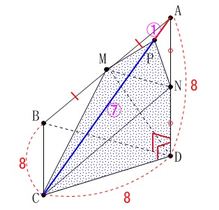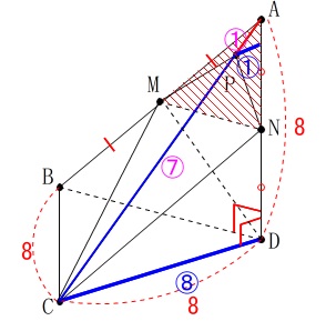 立体\(\,\mathrm{P-AMN}\,\)の体積は底面を\(\,\mathrm{△AMN}\,\)と見ると、