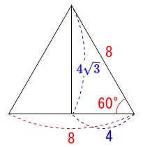 全体の立体は底面が1辺\(\,\mathrm{\color{red}{8}cm}\,\)の正三角形、