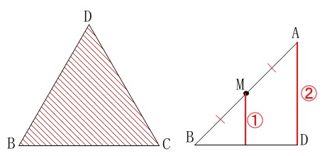 なので立体\(\,\mathrm{M-BCD}\,\)の体積は\(\,\displaystyle \frac{1}{2}\,V\)。