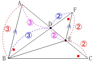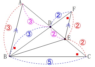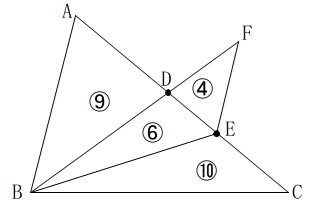 \(\,\mathrm{BD:DF=\color{blue}{③}:\color{blue}{②}}\,\)なので\(\,\mathrm{△BDE=⑥}\,\)。