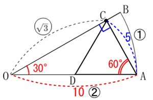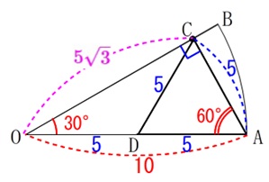 \(\,\mathrm{∠COA}=\color{black}{\fbox{ 30 }}\,\)度,\(\,\mathrm{∠CAO}=\color{black}{\fbox{ 60 }}\,\)度だから,