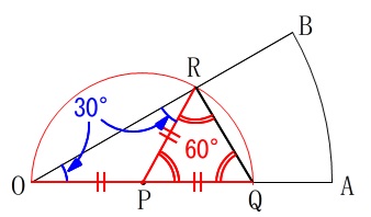 円周角\(\,\mathrm{∠ROQ=30°}\,\)なので中心角は\(\,\mathrm{∠RPQ=60°}\,\)。
